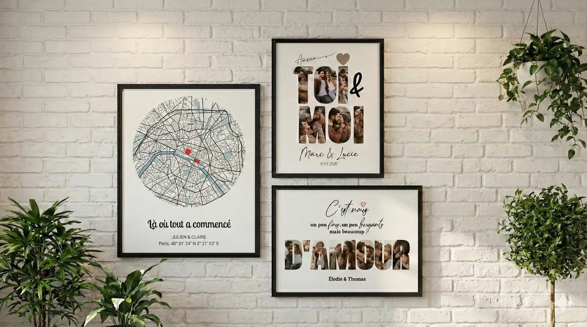 Choisissez votre modèle (carte, texte, ou photo), saisissez les informations clés comme les prénoms, la date et le lieu (ville ou adresse précise). Notre outil génère un aperçu en temps réel pour que vous puissiez visualiser votre cadeau personnalisé avant de valider la commande.